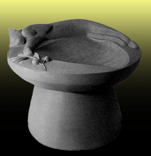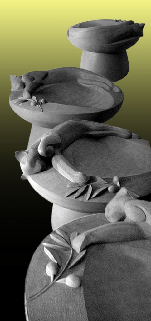 If the top of the birdbath were hung vertically like a plaque the reposing cat would look like a cat leaping for its prey. But she is touching the olive branch, slumbering, while her other paw curls in pleasure.