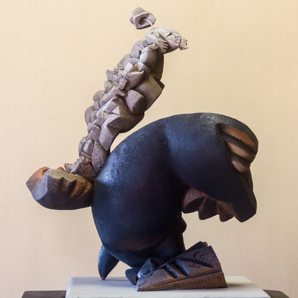 The historian Jacques Barzun called cubism a form of dissection, and dissection, for some a form of contempt. So here the cowboy descends totally into the dissecting machine of a cubist where the multiple convoluted forms turn on the subject matter for a takeover. They consume, dismantle, and dismiss it. He is not seen again until he drops out the bottom in one unhappy piece. Unlike the figure in “Rite of Passage,” he does not give double thumbs up.