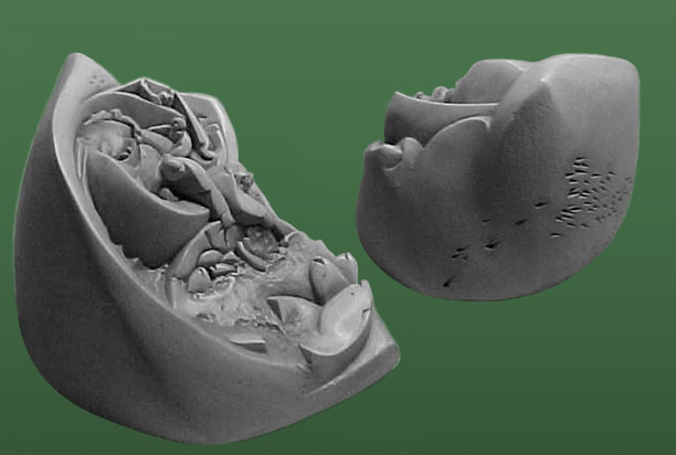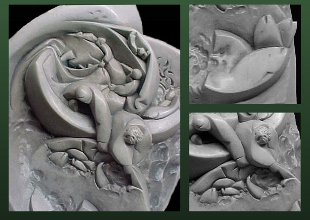 Miniatures can invite one to look long and slowly discover. This piece is a full-round sculpture composed of relief work that allows both a foreground and background. Fish and men in graduated sizes are configured to shield the smallest figures from view except where they show easily as background figures.