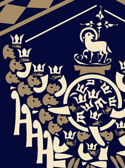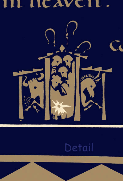 This poster is a fairly classic illustration of the twenty-four elders worshiping before the Lamb with the exception of there being a small nativity pictured below. It became my desire to express with forms and pictures a relationship between the incarnation and the resurrection that impressed itself upon me as I worked with the text. This relationship is, simply put, that in Christ’s coming down we found our going up, and we find our going up to be with Him more to the point than we find His coming down to be with us since neither He nor we were born to stay here very long. For this the elders resurrected with him form something of a giant tulip shape blossoming high above that tiny hallowed head.