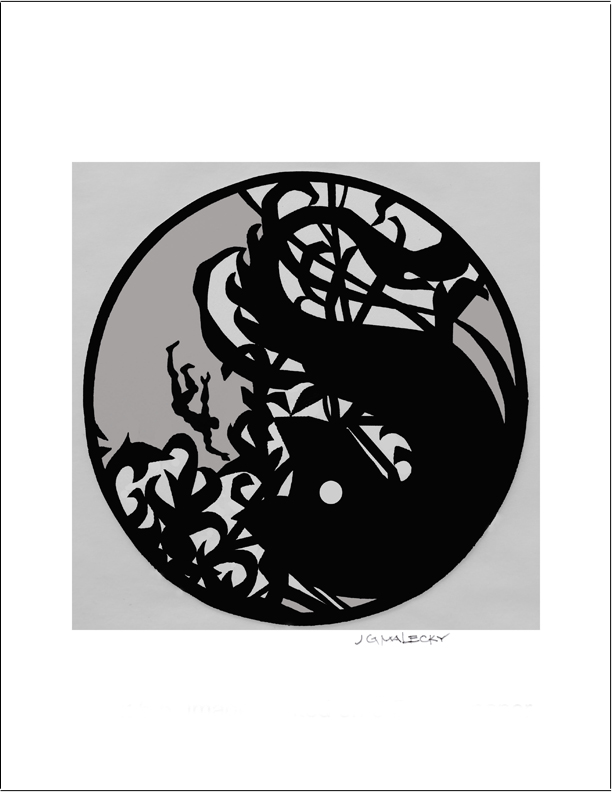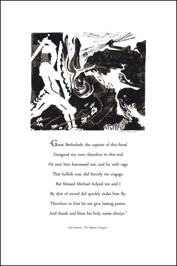 This print is a study in positive and negative space, and some staring may be necessary before it makes sense. Inspired by John Bunyan’s classic “the Pilgrim’s progress,” it depicts good and evil at war.