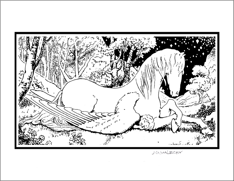 Inspiration for this drawing is from chapter 12 in “The Magician’s Nephew,” Book 1 in the Chronicles of Narnia by C.S. Lewis. Digory is on the unseen side of Fledge and Polly on the other, taking sanctuary under the horse’s wings. The three have been sent by Aslan on a dangerous mission for the protection of Narnia from the White Witch.