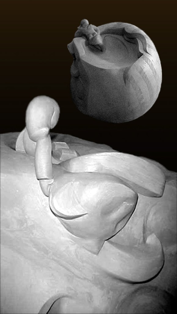 The tiger curled round the rim of the bath is about the size of every small bird’s nemesis – the house cat. As the bird-sized child bathes her feet and reads the prophet’s promise, she reads it quietly to viewers, herself an image of fulfillment, and as she squeezes the tiger’s ear he curls his paw in sleepy approval. The boulder on which this scene takes place mirrors the cat’s head up full scale to the size of a real Siberian tiger’s head, giving one a fresh appreciation for the prospect of living peacefully with such a formidable foe.